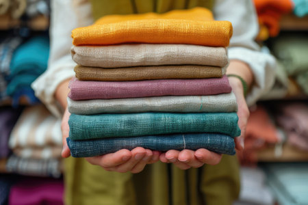 A person holds a neatly stacked pile of folded colorful linen garments. Eco friendly fabric shop.