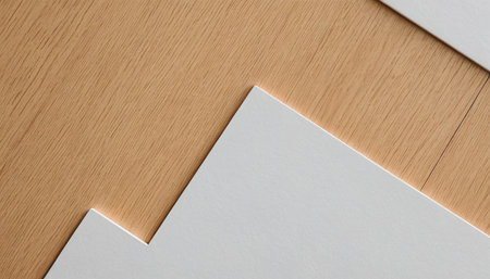 A close-up shot shows a pile of rectangular beige papers sitting on a matching brown surface. Shadows are cast across the surface creating depth.