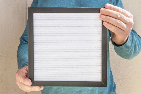 In the female hand there is a white card, inside the card there is a red frame and a text box. Black background of the picture