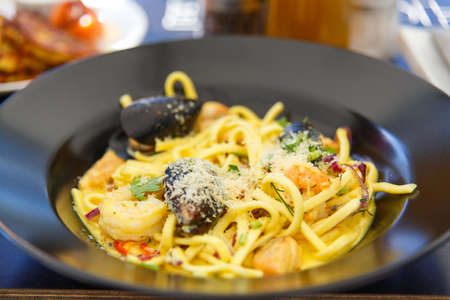 Seafood pasta Spaghetti with Clams, Prawns, Seafood Cocktail sprinkled with grated cheese