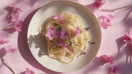 A beautifully arranged plate of pasta adorned with vibrant edible flowers sits on a soft pink background, creating a visually striking culinary presentation.