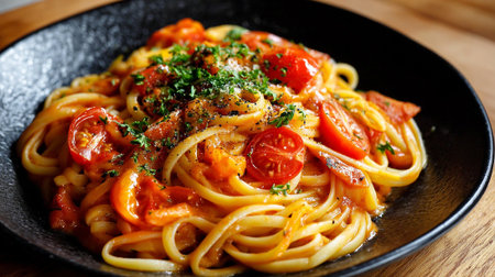 A delicious plate of linguine pasta with cherry tomatoes and herbs on a wooden table