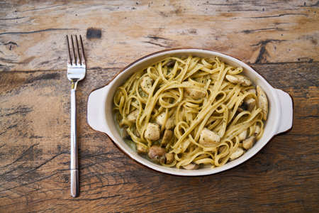 Top view of Oyster spaghetti served in white plate on white tablecloth. With copy space.