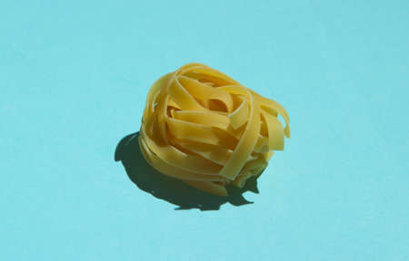 Ball of dry tagliatelle noodles on a blue background. Minimalistic food shot