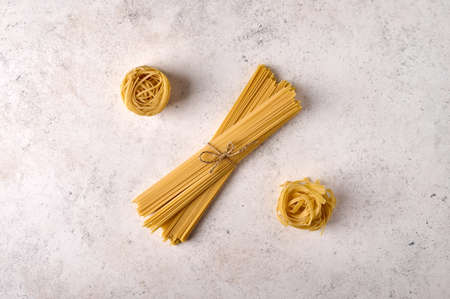 Uncooked raw bunch of spaghetti, fettuccine and tagliatelle on grey textured background. Copy space. Top view