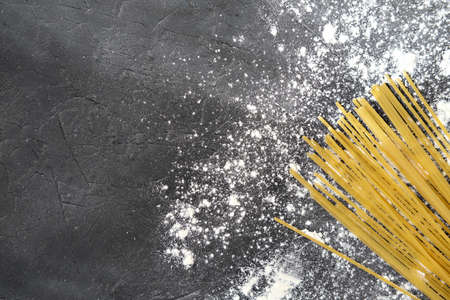 Yellow long spaghetti on gray background with flour. Yellow italian pasta. Long spaghetti. Raw spaghetti bolognese. Food background concept. Italian food and menu concept.
