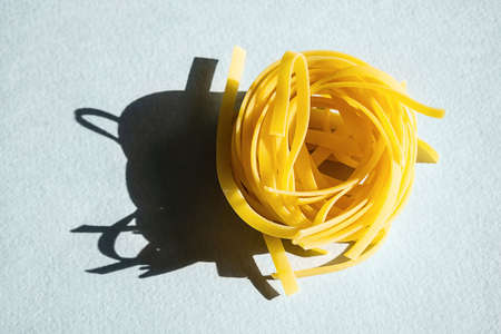 Uncooked pasta. Raw pasta nest with shadow on blue background.