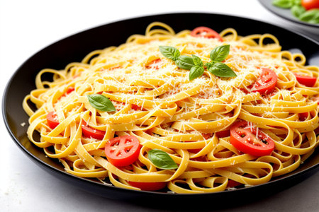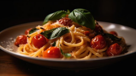 A plate of steaming hot pasta topped with fresh tomatoes and basil created with Generative AI
