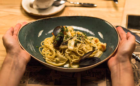 Hands with spicy spaghetti with seafood