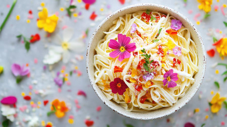 A stunning pasta dish adorned with colorful edible flowers and garnishes, beautifully arranged against a floral backdrop, showcasing vibrant culinary art.