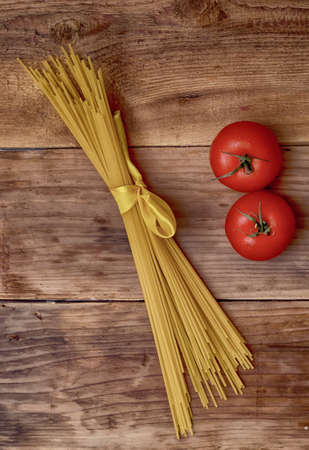 Italian food ingredients tomatos, wholemeal pasta, oil over wooden background.