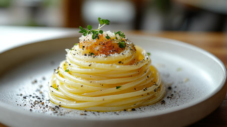 A beautiful serving of spaghetti, adorned with colorful edible flowers and fresh herbs, showcases the art of food presentation and culinary creativity.