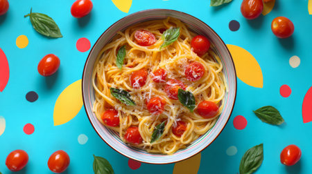 A vibrant bowl of pasta featuring cherry tomatoes and fresh basil against a colorful backdrop, ideal for showcasing culinary creativity and enticing presentations.