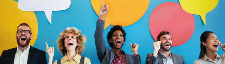 People of different races and ethnicities celebrating together, with speech bubbles in the background.
