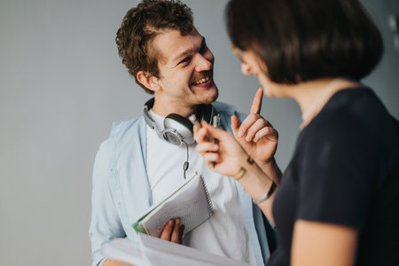 Two students happily discussing a project outdoors closeup