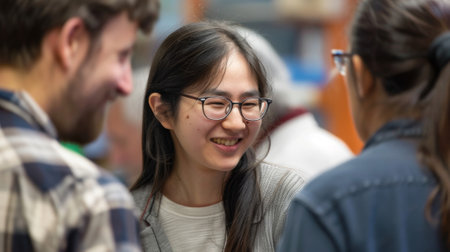 Joyful East Asian woman confidently leading a discussion or presentation in front of a colorful wall, engaging participants in an informal event.