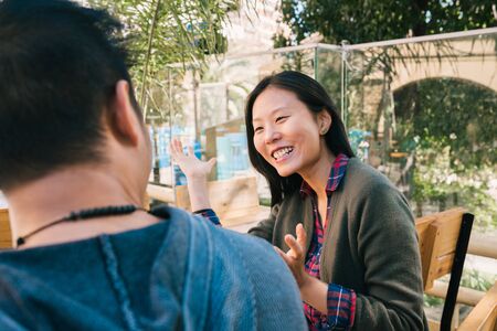 Asian couple having a conversation.