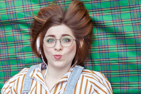 Young cheerful woman listening to music with headphones lying on a blanket in park