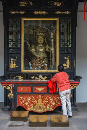 Chengdu, China - July 2019 : Chinese woman looking at the golden holy figure behing glass in an altar in a temple in the courtyard of the Buddhist Wenshu Monastery, Sichuan Province