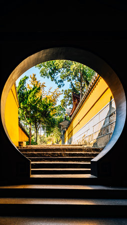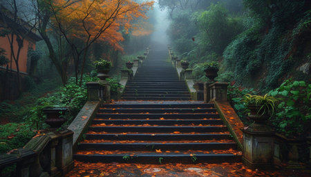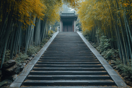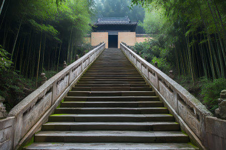 Traditional chinese landscape featuring a long stone staircase leading to a door amid bamboo forests