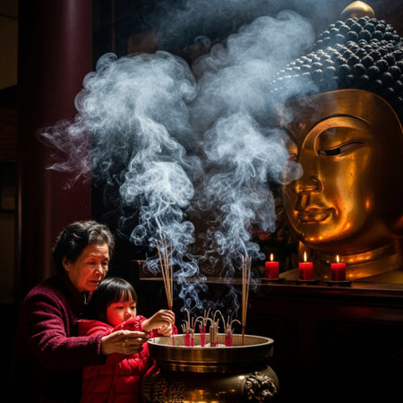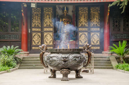 Buddha statue and woman with incense stick in chinese temple