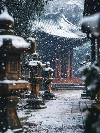 A serene and tranquil scene of a Japanese temple courtyard blanketed in a gentle snowfall with a traditional pagoda roof and lanterns casting a warm glow