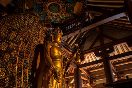 Golden Amida Nyorai Buddha statue inside the Shitennoji Kondo hall temple, Osaka, Japan. Famous travel destination for sightseeing Kansai in fall season.