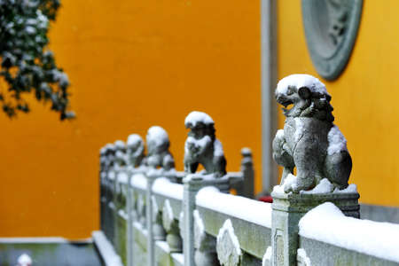 Chinese stone decorative lion sculpture close up at Lingyin Temple, Hangzhou, China