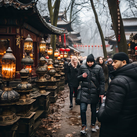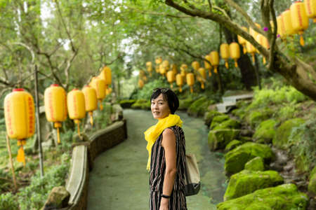 modern mature Asian woman stand at the path with lanterns at temple