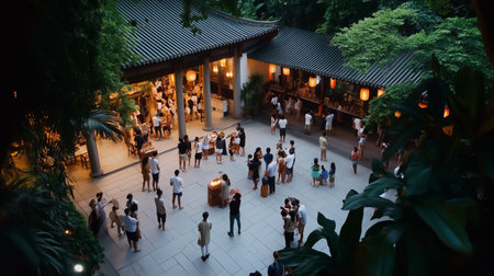 Evening gathering at a vibrant outdoor space with crowds enjoying a lively atmosphere surrounded by greenery