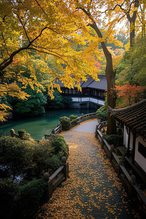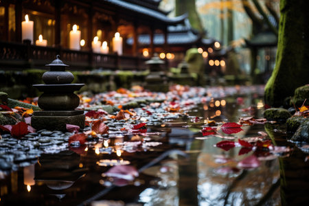A serene autumn view of a traditional Asian temple nestled in nature, adorned with vibrant foliage and glowing lanterns, creating a peaceful ambiance.