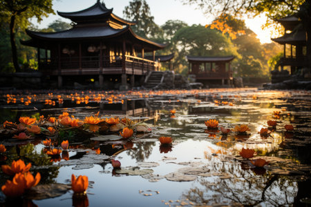 Serene dawn in Buddhist retreat., generative AI
