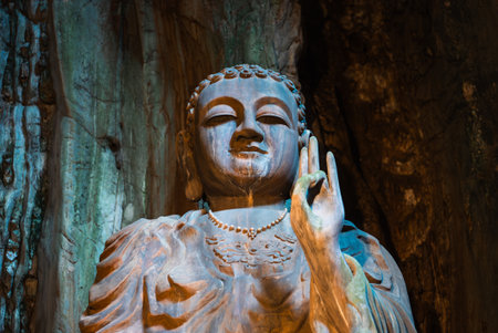 Buddha statue in colorful cave of Marble Mountains with natural light, Sacred sculpture surrounded by vibrant rocks in Marble Mountains cave
