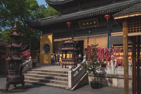 Nanxun, Zhejiang, China - 24 May 2019: Tourists entering traditional Taoist Temple of Huangdaxian in Nanxun Old Town