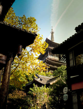 Traditional chinese pagoda standing in a peaceful garden, surrounded by trees with colorful foliage