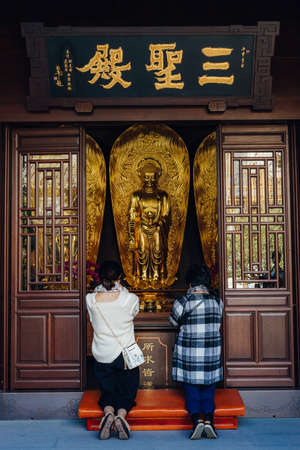 Shanghai, China; Nov 28 2017: Two women praying in buddhist temple with chinese lettering