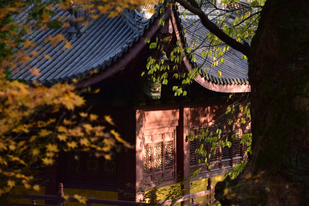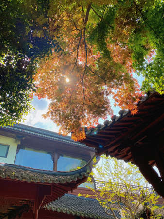 Traditional temple Shrine architecture in Osaka with autumn leaves in Japan China Fall Leaves.