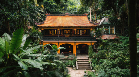 Discover a tranquil Asian house immersed in dense tropical foliage. This peaceful retreat features vibrant greenery, intricate architecture, and a serene atmosphere.