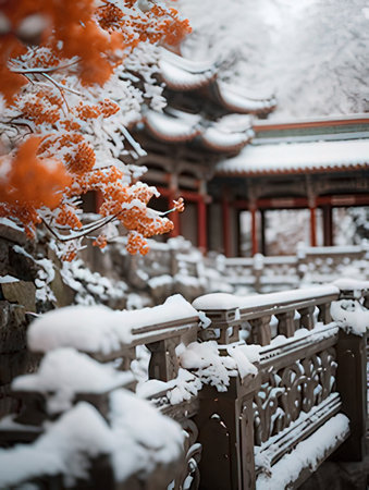 The beauty of tranquility in the snow, the Zen snow scene of the ancient temple in winter