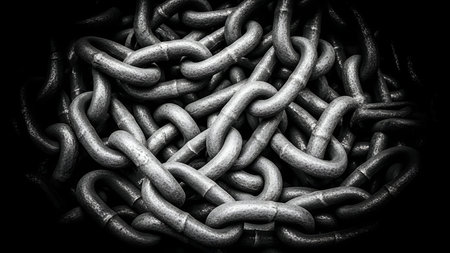 This detailed close-up image captures the interlocking links of a steel chain, showcasing its rugged texture and reflective surface, symbolizing strength and connection.