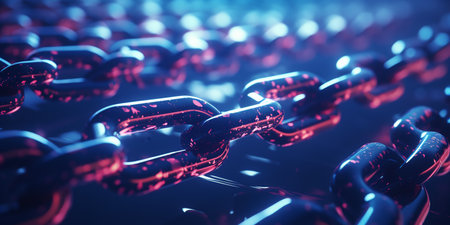This image showcases a series of interlocking metal chain links, bathed in the glow of blue and green neon lights. The metallic texture of the chains is highlighted, with reflections and shadows adding to their dimensionality. The scene evokes a sense of robust connection and technological advancement, suitable for themes related to security, networks, or digital systems.
