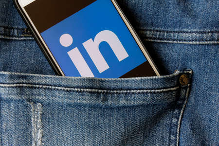 Rio de Janeiro, Brazil - February 14, 2020: Linkedin logo on the smartphone screen, in the pocket of jeans. is a business social network