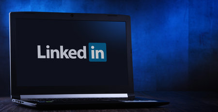 POZNAN, POL - NOV 14, 2019: Laptop computer displaying logo of LinkedIn, an American business and employment-oriented service that operates via websites and mobile apps