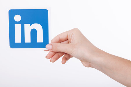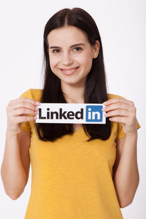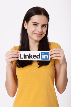 KIEV, UKRAINE - August 22, 2016: Woman hands holding Linkedin logo sign printed on paper on white background. Linkedin is business social networking service.