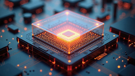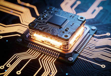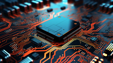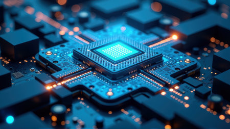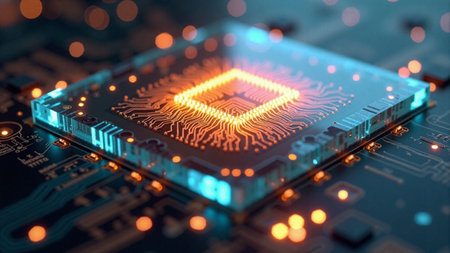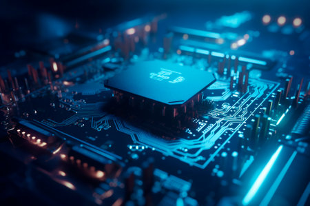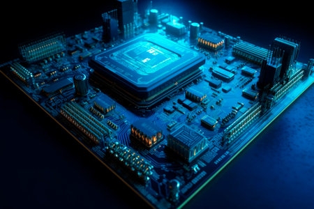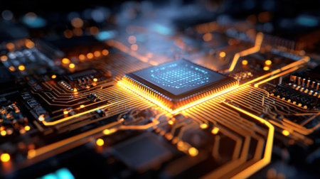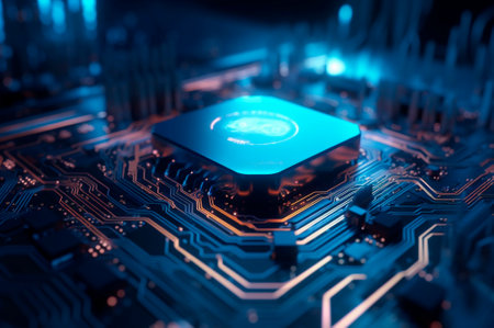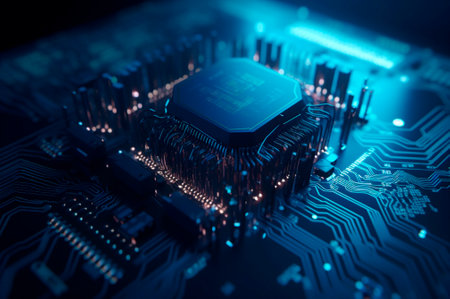 Futuristic circuit board with glowing microchip in high-tech environment.
