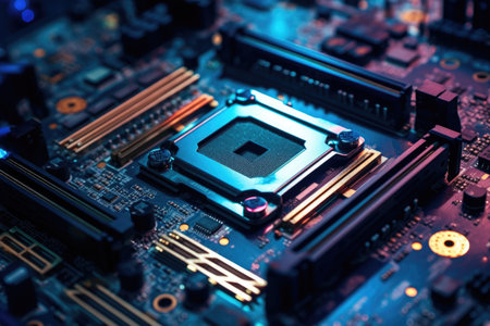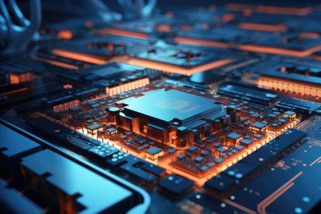 Close up of computer chip on circuit board with yellow and blue lights. Generative AI.