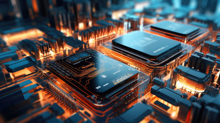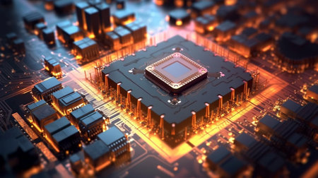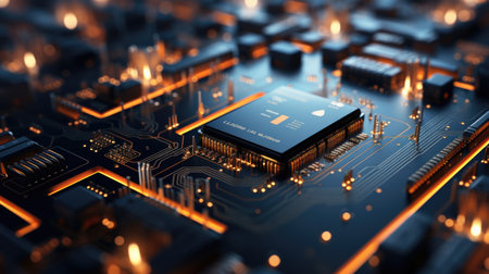 This scene reveals a close-up view of a microprocessor on a circuit board featuring detailed circuitry and a warm glow from LED lights. The image captures the complexity and innovation of technology.