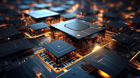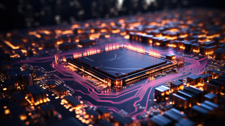 Complex computer chip circuit board showcases futuristic technology and engineering generated by artificial intelligence