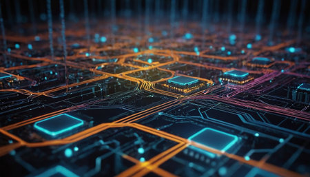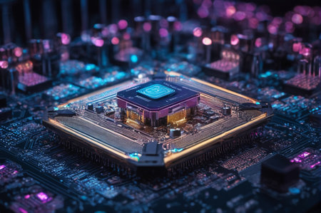 This stunning close-up image captures a detailed circuit board illuminated with glowing elements, representing advancements in technology and electronics integration.