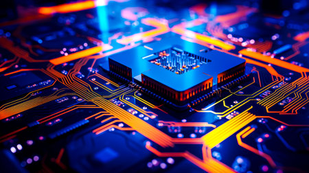 Futuristic circuit board with glowing microchip